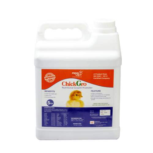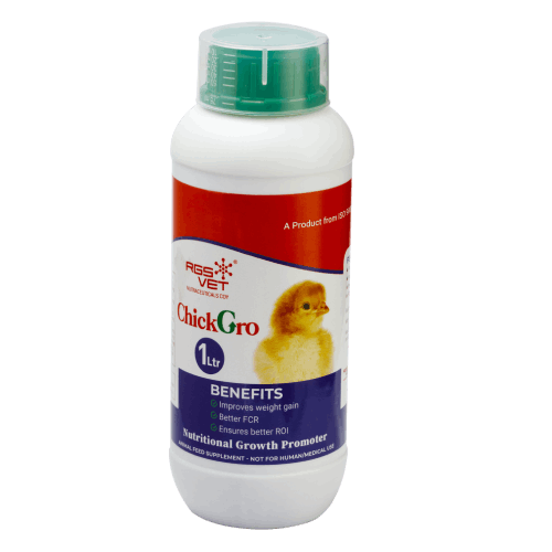 RGS Vet Chick Gro is a highly bioavailable supplement packed with functional nutrients essential for sustained growth, uniformity, and peak production. It is enriched with essential amino acids, trace elements, and live functional growth promoters to enhance poultry health. This powerful formulation supports optimal nutrient absorption, strengthens immunity, and reduces early mortality. By promoting uniform development, Chick Gro ensures better body weight and improved feed efficiency. Ideal for all poultry stages, it helps achieve maximum productivity and overall flock performance.