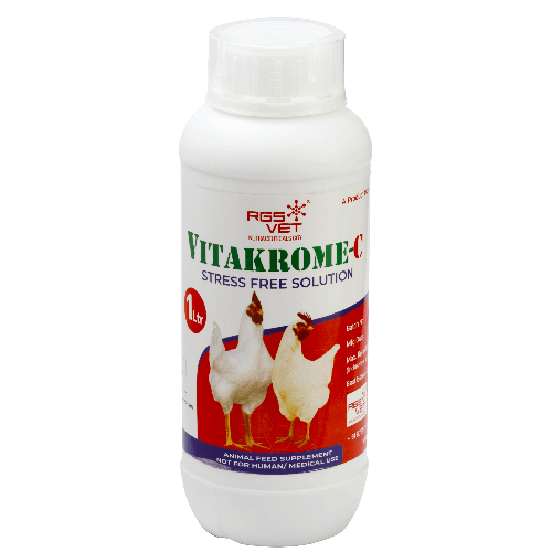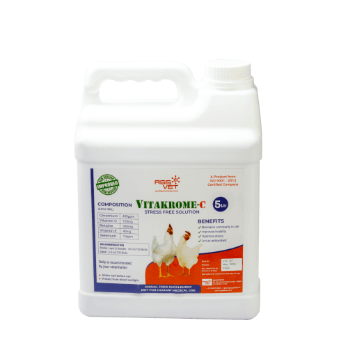RGS Vet Vitakrome C is a powerful poultry supplement enriched with Vitamin C, designed to boost immunity, reduce stress, and enhance overall health in poultry. Formulated to combat heat stress and improve resistance against infections, Vitakrome C ensures optimal growth, better productivity, and stronger birds. Ideal for all types of poultry farming, it supports healthier flocks and maximized performance.
